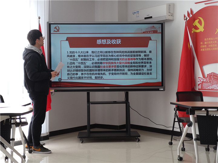 金睦皓首先领学了《中国共产党第十九届中央委员会第五次全体会议公报》的主要内容,并结合专业知识分享了学习感悟和体会。纪浩杰、陆晗、付泳易、盛啸、任娜等同志从多角度分享了各自的学习心得。