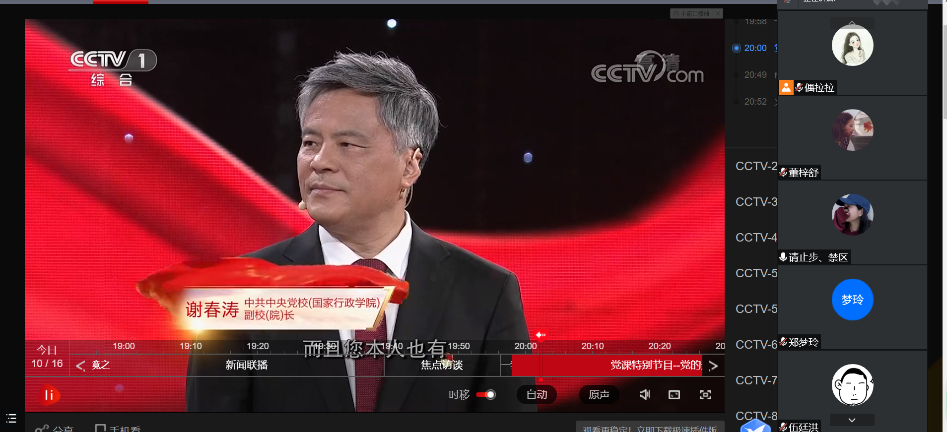 为深入学习贯彻习近平总书记在庆祝中国共产党成立100周年大会上的重要讲话精神,中央组织部、中央广播电视总台联合录制了《党课开讲啦》节目。第1期《党的光辉历程》(中央党校副校长谢春涛主讲)于10月16日(星期六)晚间8点档在中央电视台综合频道(CCTV-1)播出,bat365在线平台各学生党支部积极组织观看学习,并展开讨论交流。