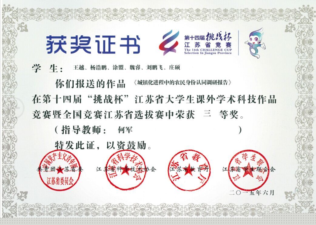 日前,由共青团江苏省委、省科协、省教育厅、省学联主办的第十四届“挑战杯”江苏省大学生课外学术科技作品竞赛落下帷幕,我院周力副教授指导的作品《H7N9风险下养禽户行为的空间溢出效应研究——基于高邮市的调研》(作者:刘馨月、刘常瑜、李静)荣获二等奖,何军教授指导的作品《城镇化进程中的农民身份认同调研报告》(作者:王越、杨浩鹏、涂盟、魏睿、刘鹏飞、庄硕)荣获三等奖,学院获奖数全校第一。