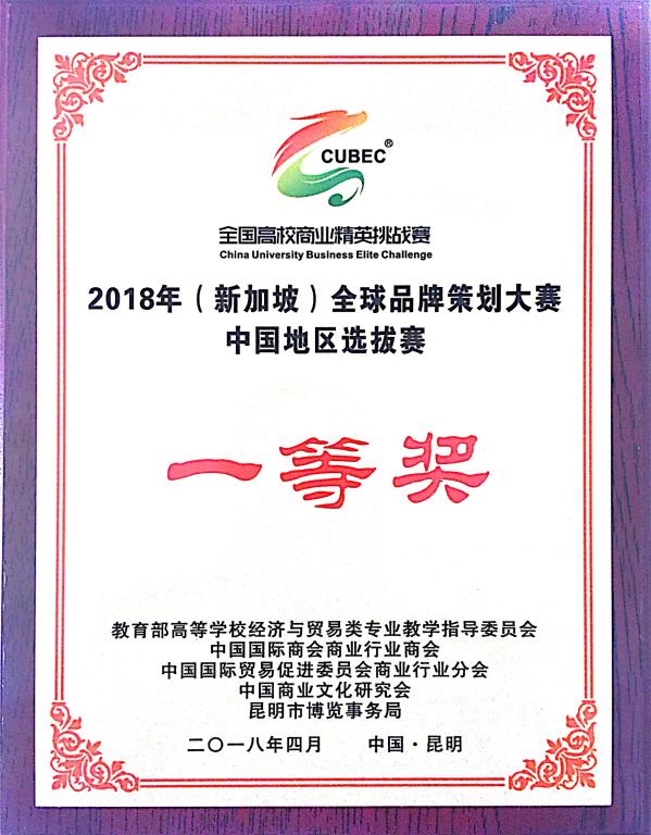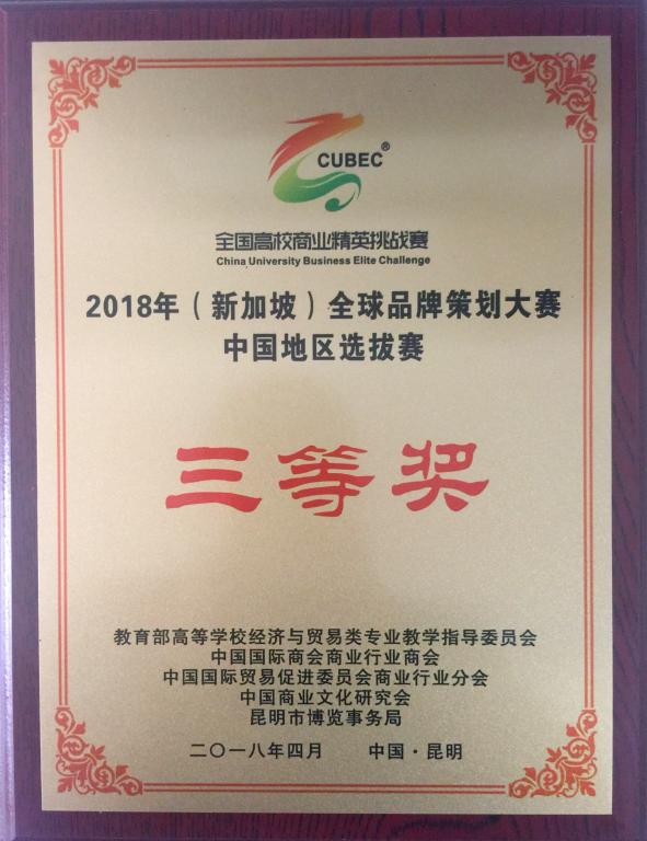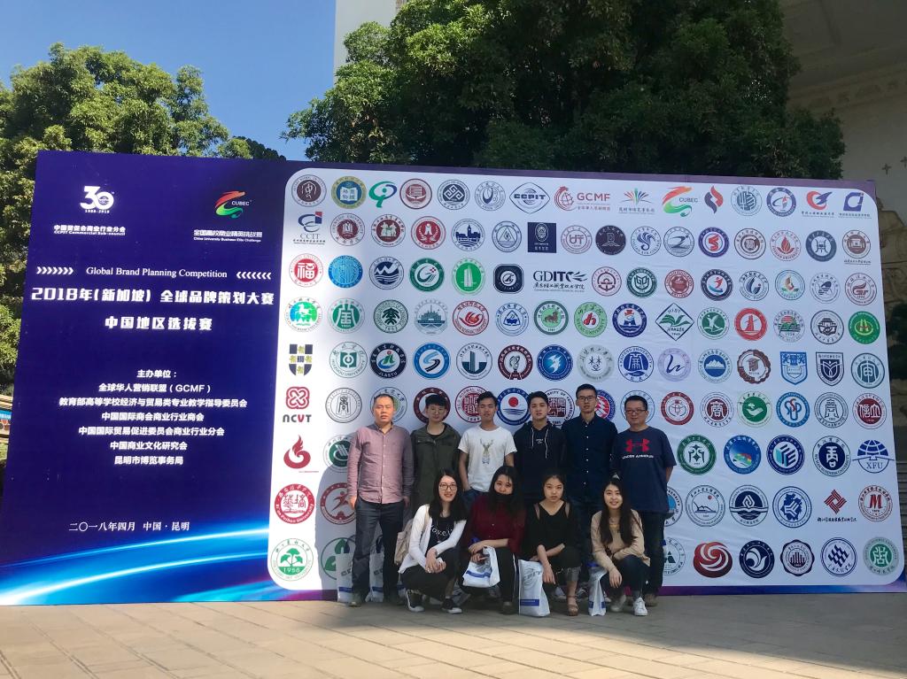 4月25日,2018年(新加坡)全球品牌策划大赛中国地区选拔赛在昆明圆满落幕,我校由bat365在线平台张兵兵老师和田曦老师带队并指导的八位同学组成两支队伍参赛,并斩获佳绩。其中,张雅楠、叶竹西、李玥闻、陈凯诚组荣获一等奖,王猛、王猛、田镯、陈忆娴、许逸凡组荣获三等奖。