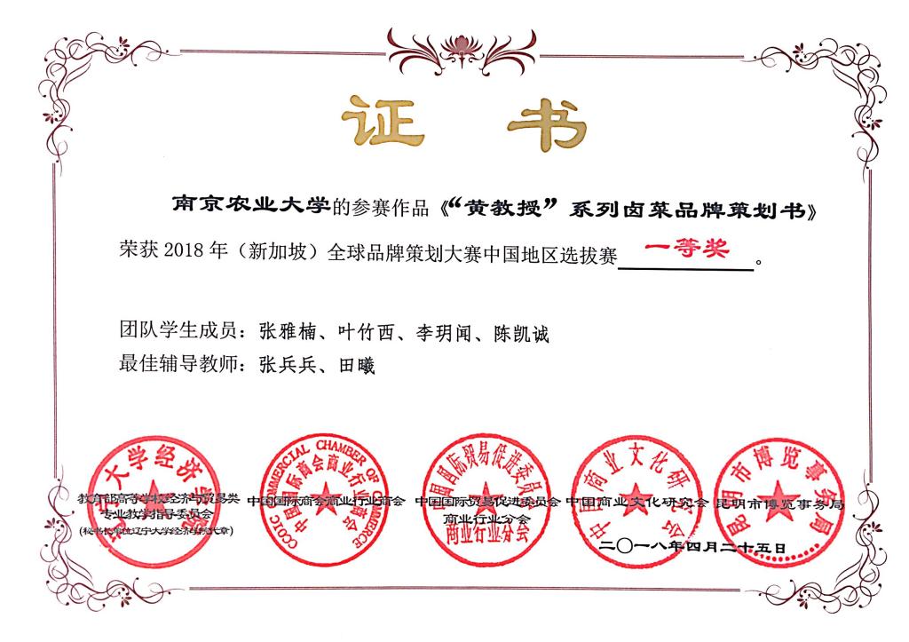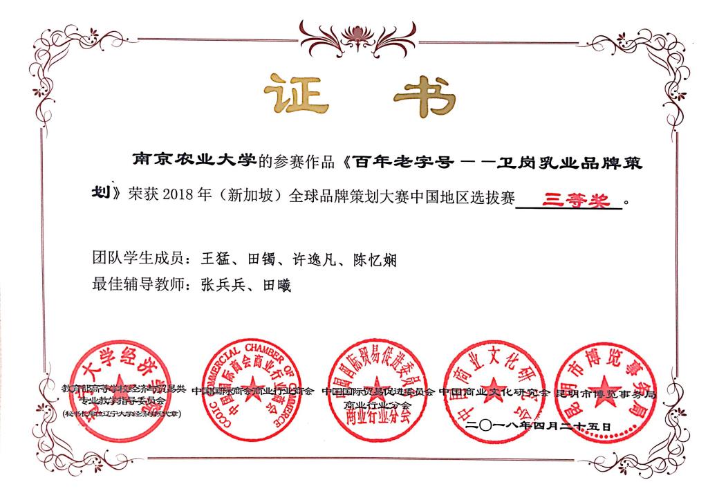 2018年报名参赛院校数量和参赛人数再创历史新高,共有来自全国26个省市、自治区、直辖市和特别行政区的148所高等院校500支参赛队伍报名。此次昆明决赛共有130所院校的258支团队入围,竞争异常激烈,最终共有200支团队赴现场参赛。我校经管院张兵兵老师和田曦老师带队的两支品牌策划团队双双入围,于4.22前往昆明参加中国地区选拔赛。其中,由张雅楠、叶竹西、李玥闻、陈凯诚组成的“下马坊品牌策划工作室”带去的参赛作品《“黄教授”系列卤菜品牌策划书》在比赛中荣获一等奖,由王猛、田镯、陈忆娴、许逸凡组成的“南京四叶草品牌策划工作室“带去的参赛作品《百年老字号——卫岗乳业品牌策划书》在比赛中荣获三等奖并在展洽赛中获得二等奖。南农学子在百家企业及学界同行面前,再次展现了我校学生扎实的专业水平与优秀的综合素质,为学校赢得了良好的声誉。