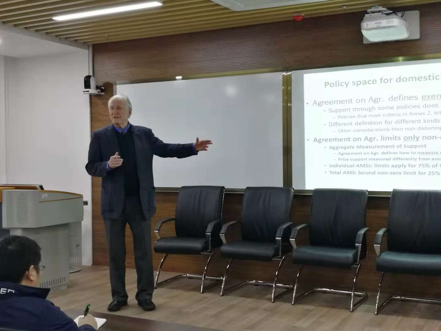 Lars Brink 教授首先简要介绍了世界贸易组织的宗旨、目标,基本原则,以及WTO农业协定中的三大支柱:国内支持,市场准入和出口补贴政策。随后重点介绍了WTO农业协定中的“绿箱政策”“黄箱政策”和“蓝箱政策”。Lars Brink 教授指出在产生贸易扭曲的政策中,WTO要求用综合支持总量(AMS)来计算其措施的货币价值,并逐步削减。接着,Lars Brink 教授针对国内支持选取一些问题进行了探讨,如进口补贴,不同国家参与世贸组织的影响力等。